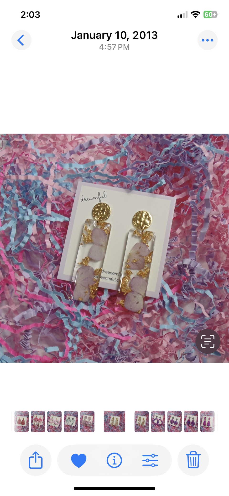 Purple hydrangea petals plucked fresh from the garden, preserved and encapsulated in epoxy resin. Includes hypoallergenic stainless steel earring studs ion-plated in real 18k gold, and silicone backs to keep those suckers in place. Lightweight, nickel free, lead free, and easy to wear all day!