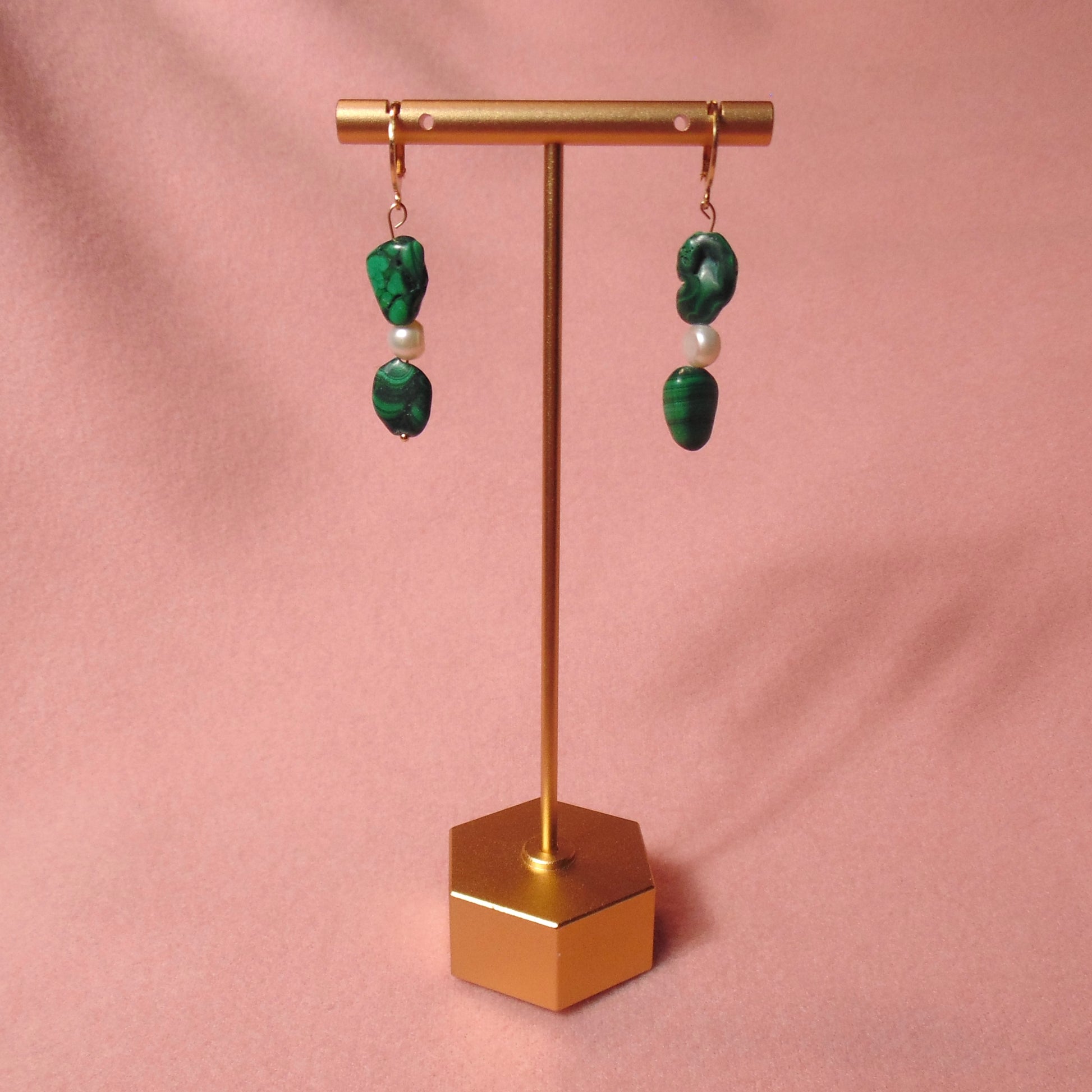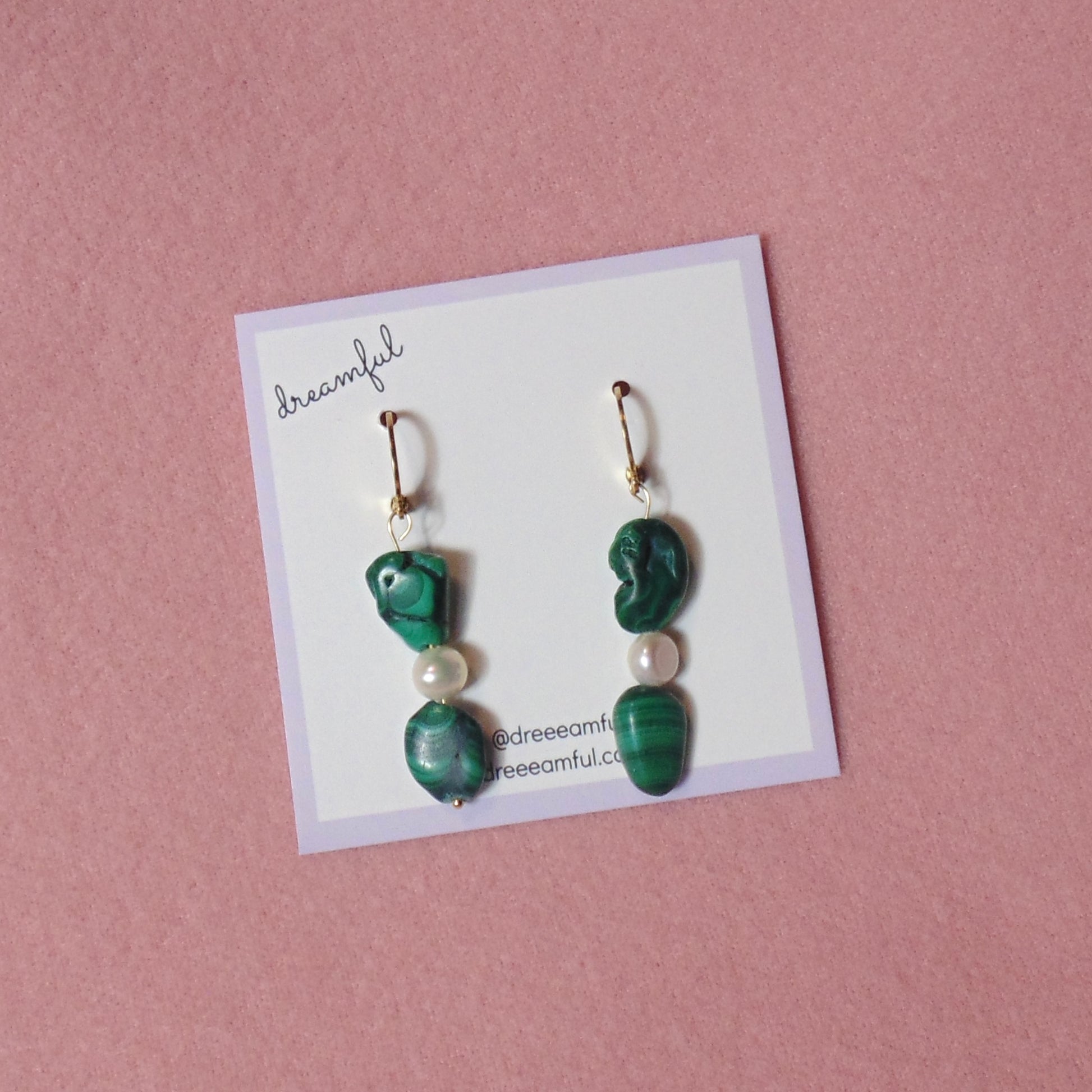 One pair of South African malachite & cultured freshwater pearl earrings with your choice of either stainless steel or 18k gold ion-plated hoops. Lightweight, nickel free, lead free, and easy to wear all day!
