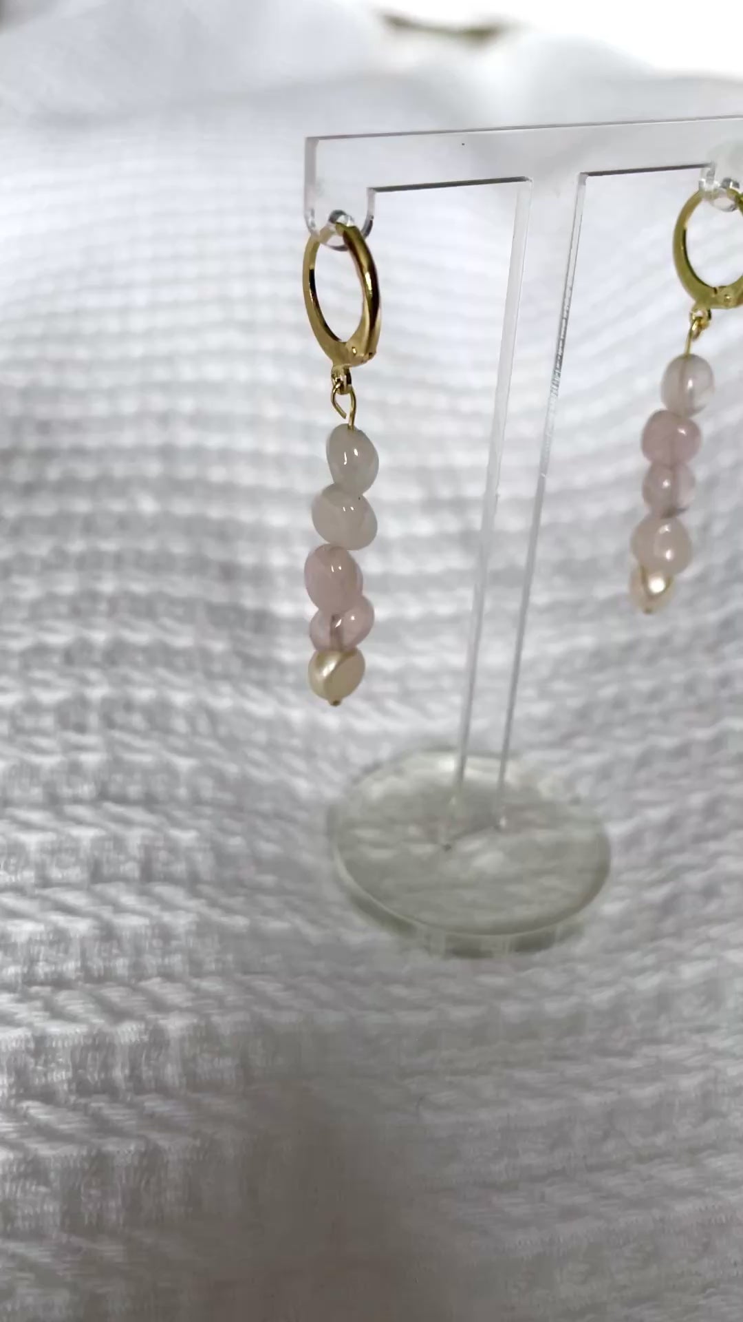 One pair of earrings made with genuine rose quartz from Madagascar & cultured freshwater pearl earrings. Includes hypoallergenic stainless steel hoops ion-plated in real 18k gold. Lightweight, lead free, nickel free, and easy to wear all day!