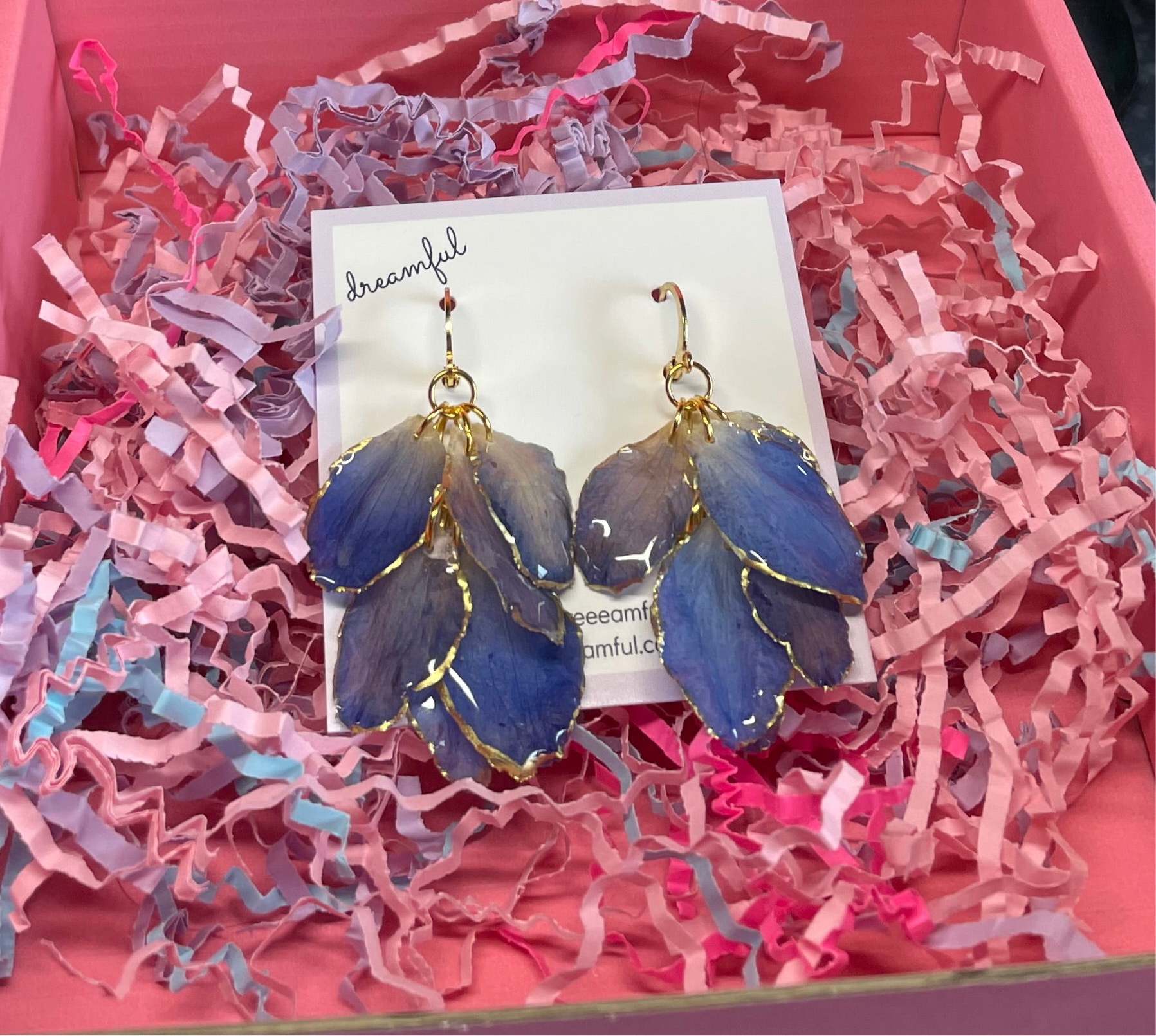 Blue delphinium petals plucked fresh from the garden, preserved and encapsulated in epoxy resin. Includes hypoallergenic stainless steel earring studs (or hoops) ion-plated in real 18k gold, and silicone backs to keep those suckers in place. Lightweight, nickel free, lead free, and easy to wear all day!