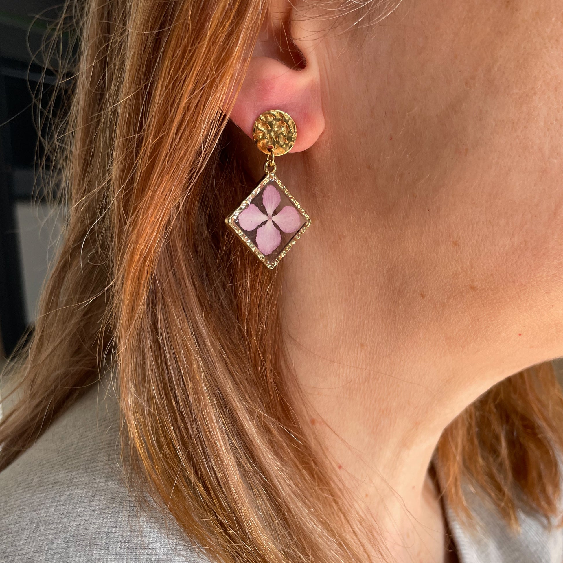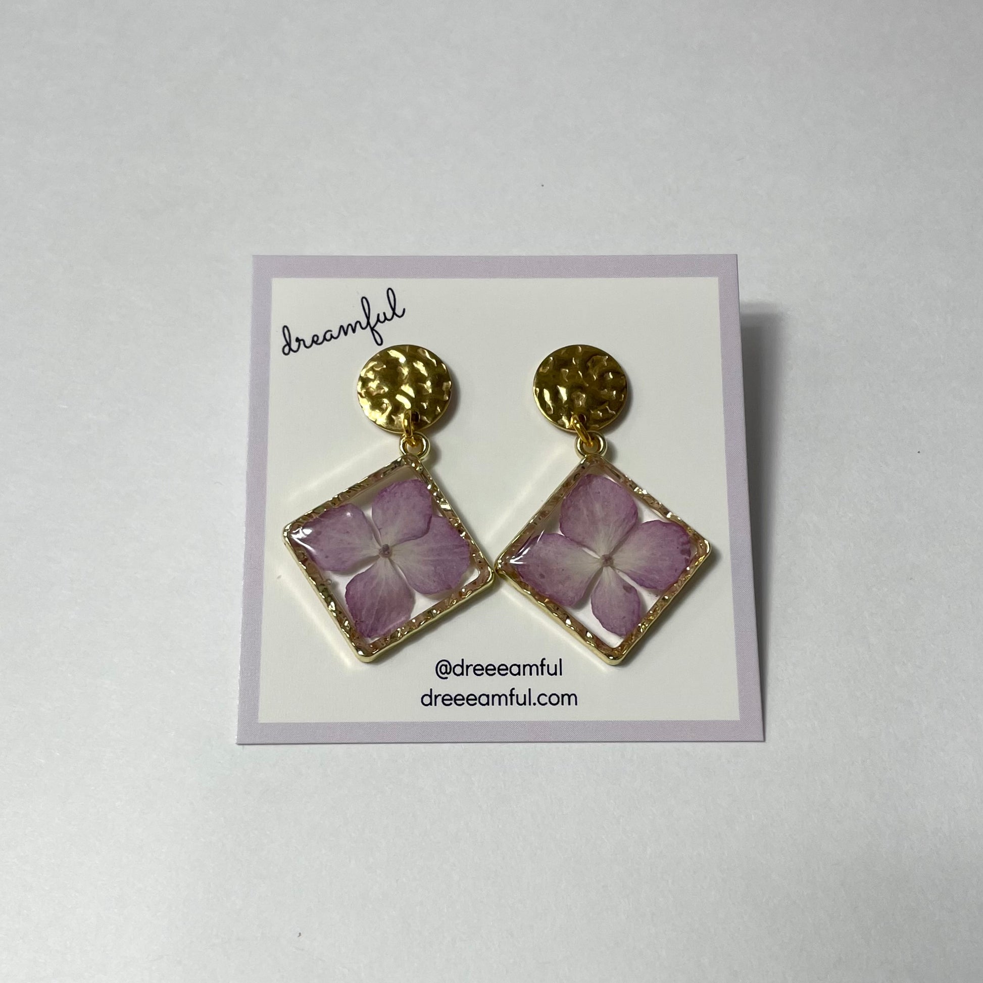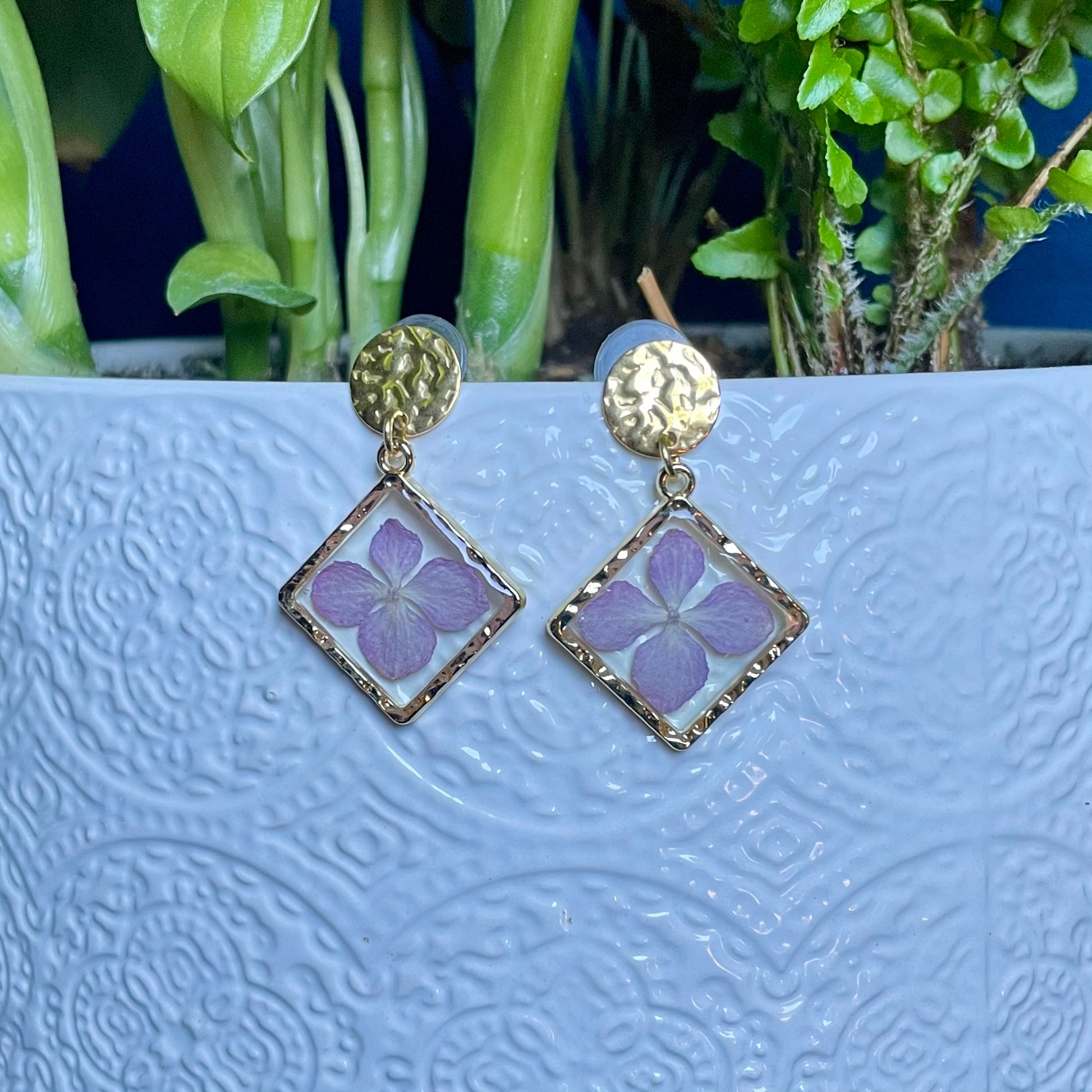 Purple hydrangea petals plucked fresh from the garden, preserved and encapsulated in epoxy resin. Includes hypoallergenic stainless steel earring studs ion-plated in real 18k gold, and silicone backs to keep those suckers in place. Lightweight, nickel free, lead free, and easy to wear all day!