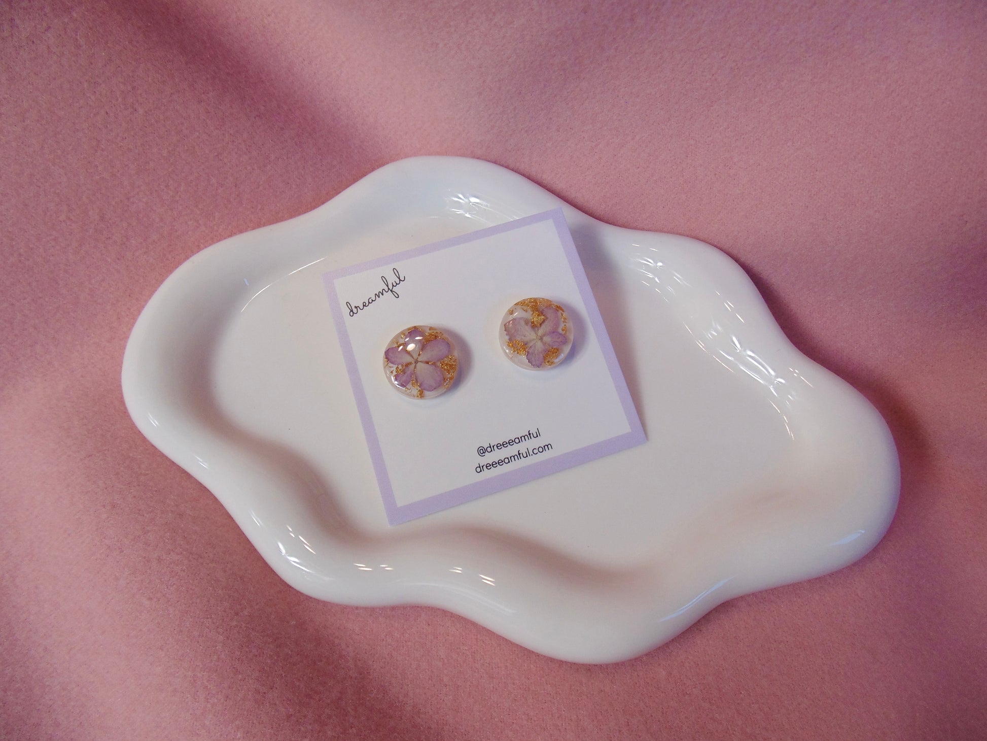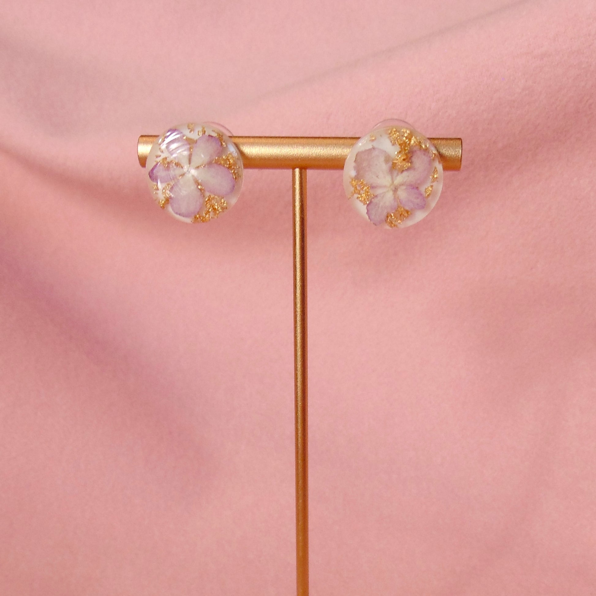 Purple hydrangea petals plucked fresh from the garden, preserved and encapsulated in epoxy resin. Includes hypoallergenic stainless steel earring studs ion-plated in real 18k gold, and silicone backs to keep those suckers in place. Lightweight, nickel free, lead free, and easy to wear all day!