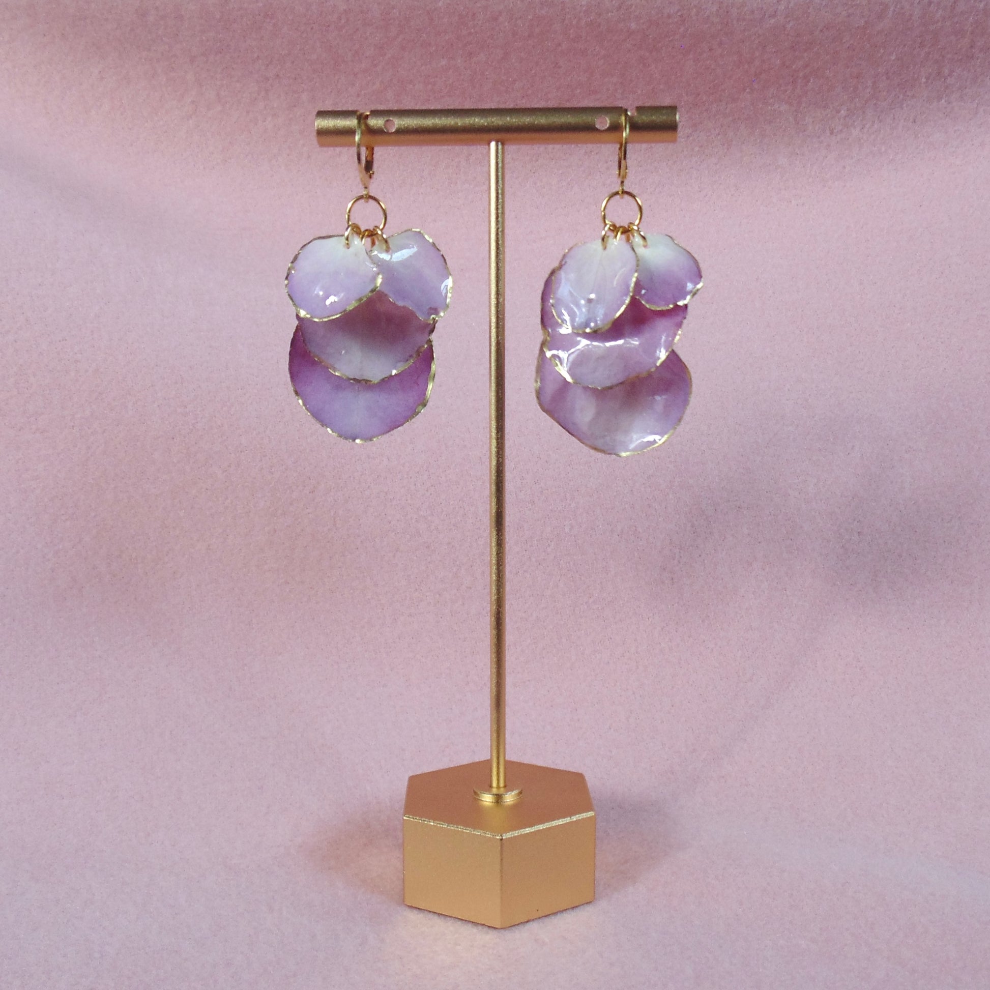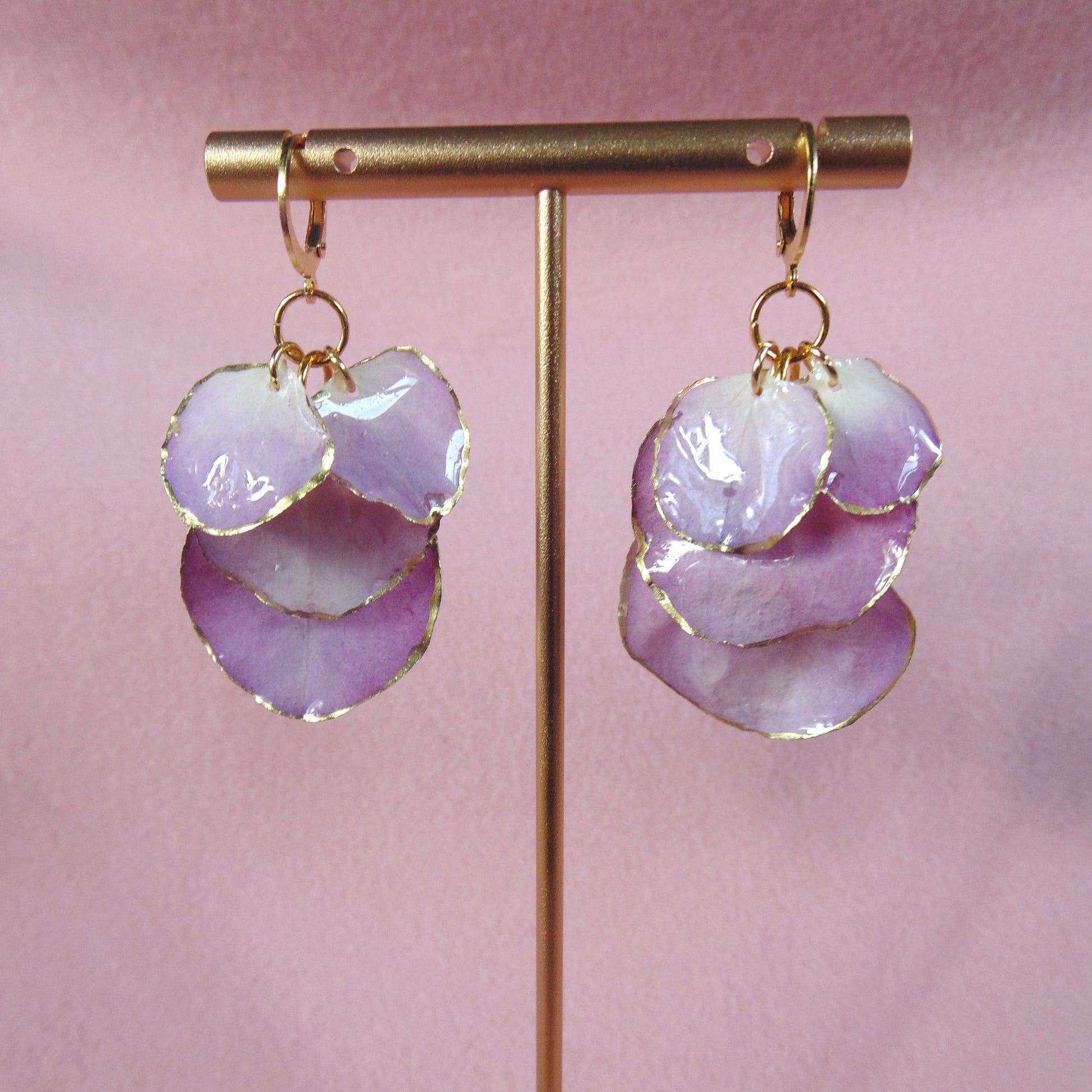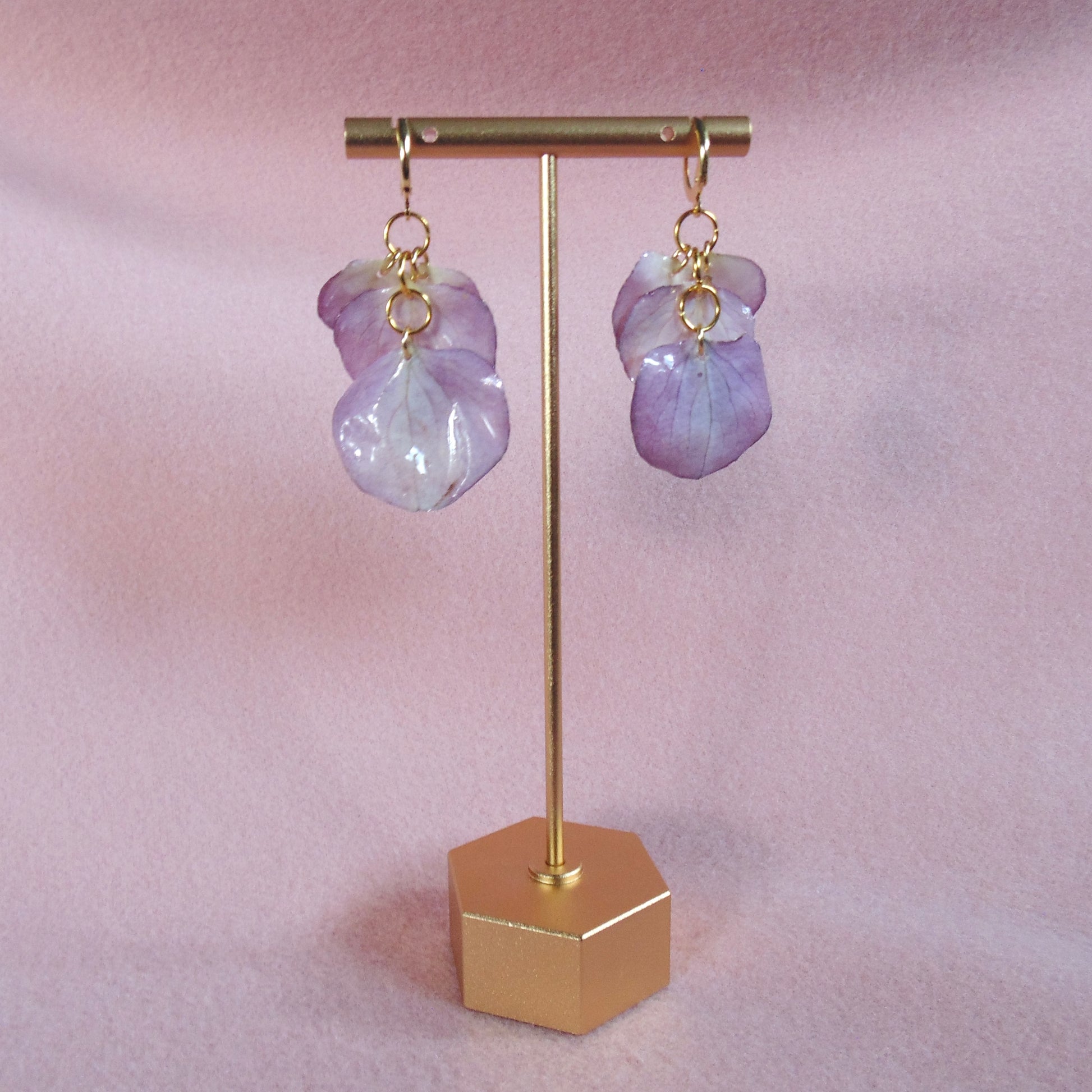 Purple hydrangea petals plucked fresh from the garden, preserved and encapsulated in epoxy resin. Includes hypoallergenic stainless steel earring hoops ion-plated in real 18k gold, and silicone backs to keep those suckers in place. Lightweight, nickel free, lead free, and easy to wear all day!